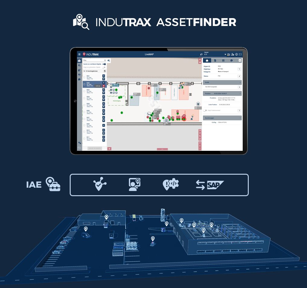 Mit dem INDUTRAX ASSETFINDER behalten Sie Ihre beweglichen Assets wie Transportmittel, Aufträge, Werkzeuge oder beliebige Objekte jederzeit und standortübergreifend in Echtzeit im Blick.