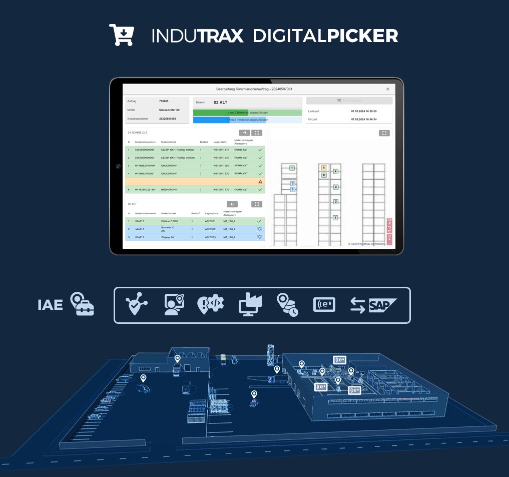 Mit dem INDUTRAX DIGITALPICKER führen Sie Ihre Mitarbeitenden durch die Kommissionierung und beim Verwalten von Fehlteilen. Sie sorgen in Echtzeit für Transparenz, mehr Geschwindigkeit und klare Abläufe. Die Verfügbarkeit wird planbar, denn die Mitarbeitenden wissen in Echtzeit, was wo gebraucht wird.