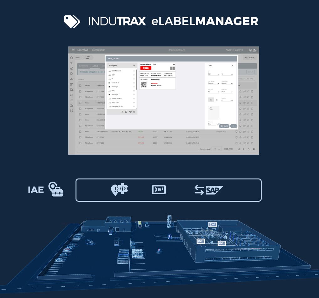 Mit dem INDUTRAX eLABELMANAGER steuern und aktualisieren Sie per Regelwerk Ihre Produktions- und Logistikinformationen direkt über elektronische Etiketten (E-Labels). Sie beenden die Zettelwirtschaft, vermeiden Fehler und machen Ihre Prozesse effizienter.