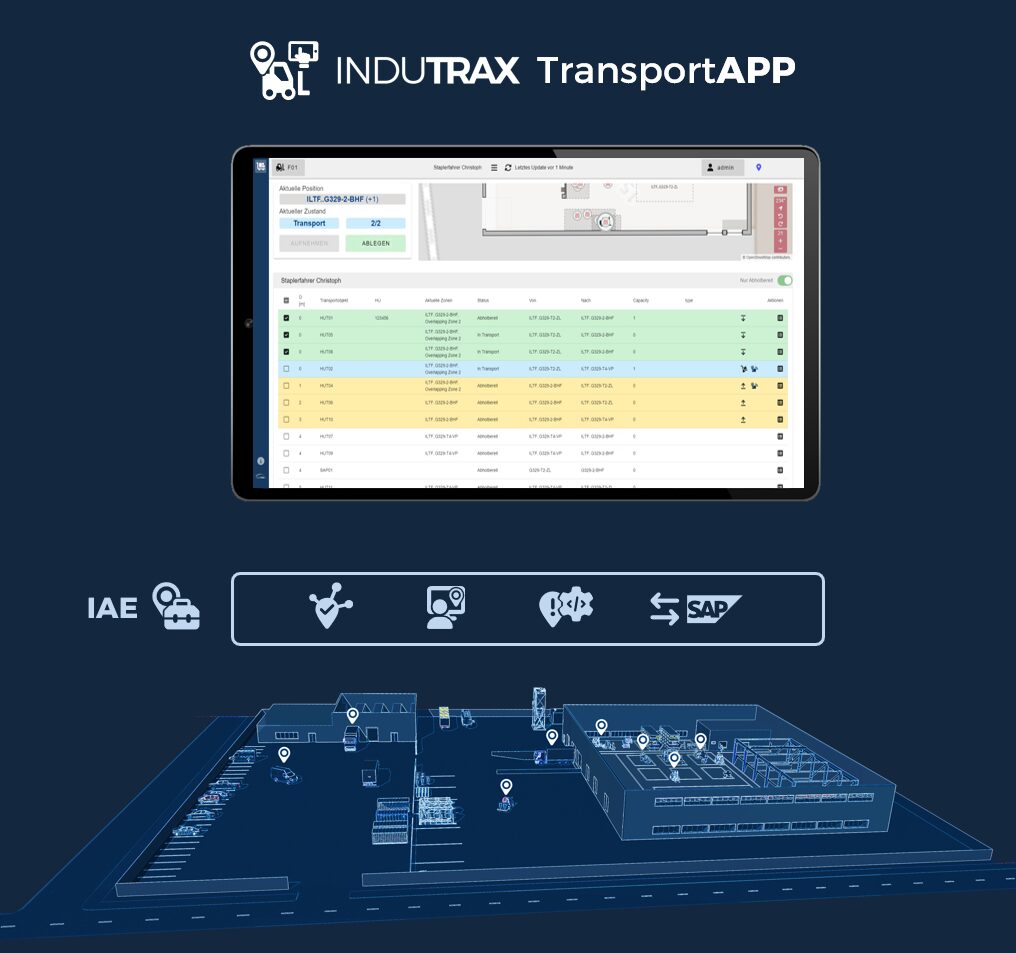 Mit der industriellen mobilen App TransportAPP von INDUTRAX unterstützten Sie Fahrkräfte bei der eigenständigen Durchführung der innerbetrieblichen Transporte. Dabei können Sie Aufträge klar priorisieren und Ihren Fahrkräften via Tablet direkt und in Echtzeit anzeigen lassen. Sie selbst haben dabei stets den vollen Überblick und bekommen automatische Rückmeldungen.